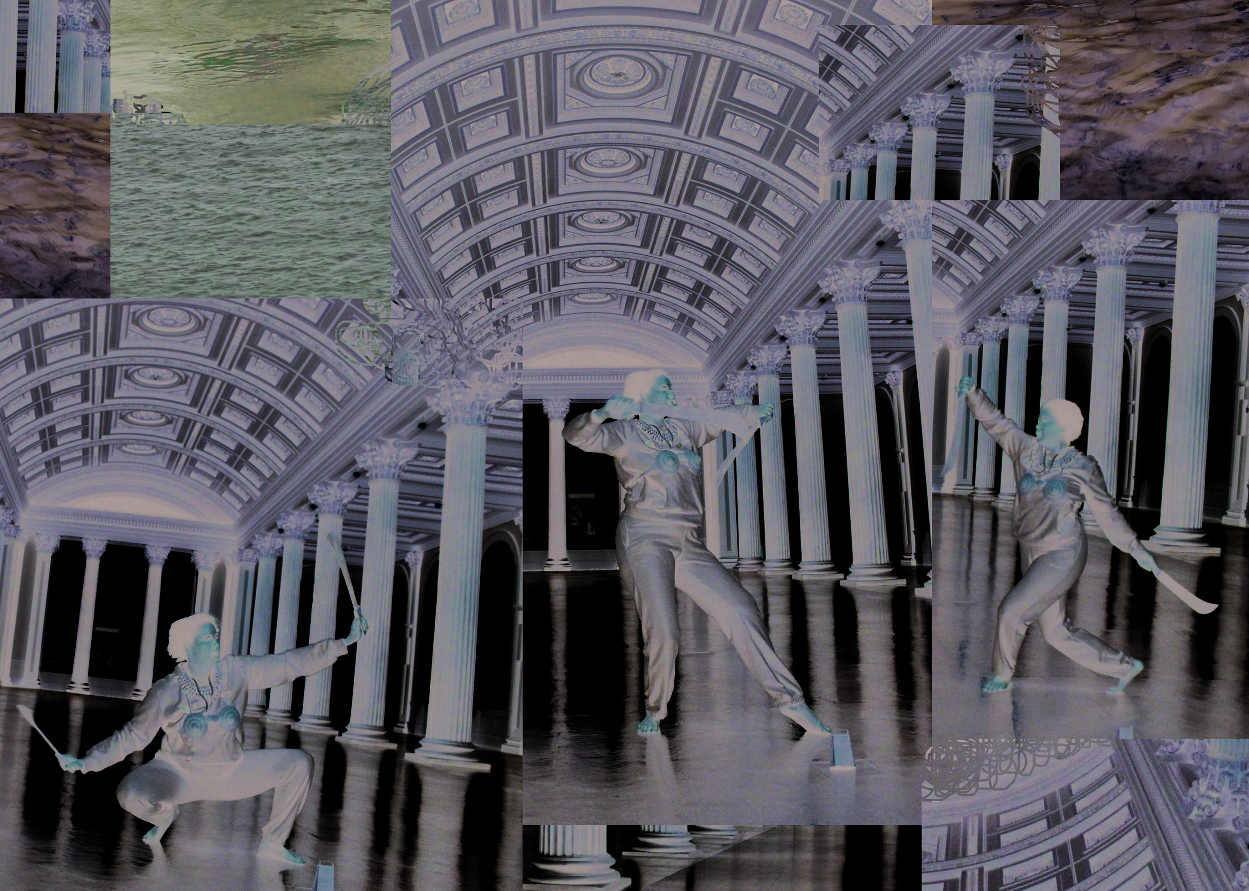 In A study in vocal intonation (2018) we see the body majestic, as ancestral memory confronts veiled histories in a performance that forms the central axis of the film. Brandishing a large cane knife in each hand, Whittle moves regally across the neoclassical hall of Glasgow’s Gallery of Modern Art, originally built as a private mansion of Scotland’s sugar aristocracy. Elsewhere, the body seems to perform a kind of resurrection, as in her most recent film RESET (2020), an elegy to a year of black loss and mourning. Here, one of the central figures is that of choreographer and performer Mele Broomes. Adorned in an armature of seagrass and shells, her posturing shifts between the statuesque and the glitchy, yet her trajectory and gaze are always turned skyward. The irrepressible vitality of black life is echoed in the montage of found footage that cuts through these filmed sequences: newsreel of worldwide protest and rebellion captures bodies in uprising; recurring images of a serpent evoke the mystical ouroboros, ancient symbol of eternal renewal; a man performs the limbo, a symbolic dance that originated as a Trinidadian funeral ritual, while also recalling the bent bodies of slaves as they entered the hold of the ship.