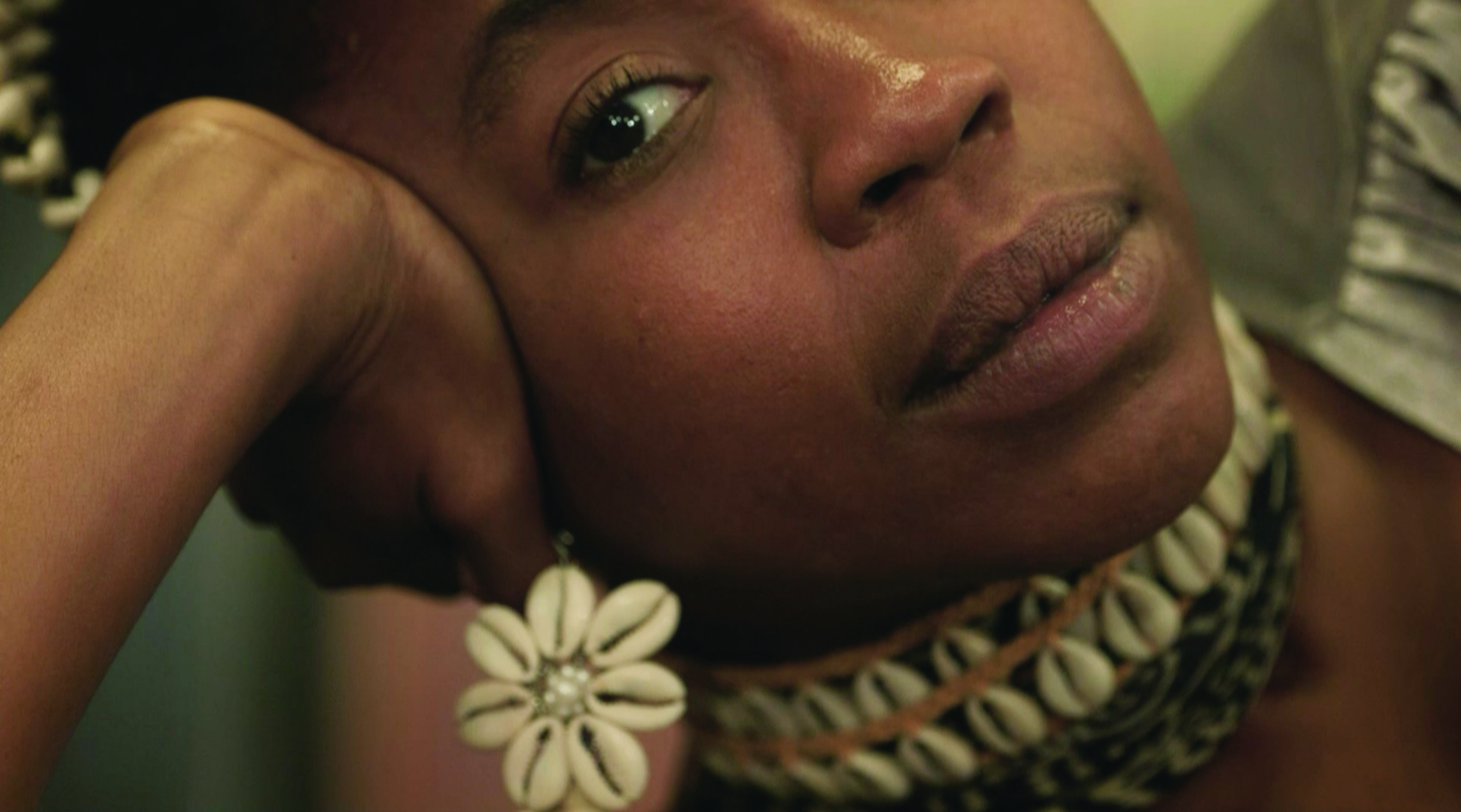 The frame cuts in around the mouth of a singer, her image doubled and mirrored. A voice, raw and powerful, soars over skittering drums; the voice as shaped sound, unmaking and remaking spells of meaning in an alternate vision of black futurity.
