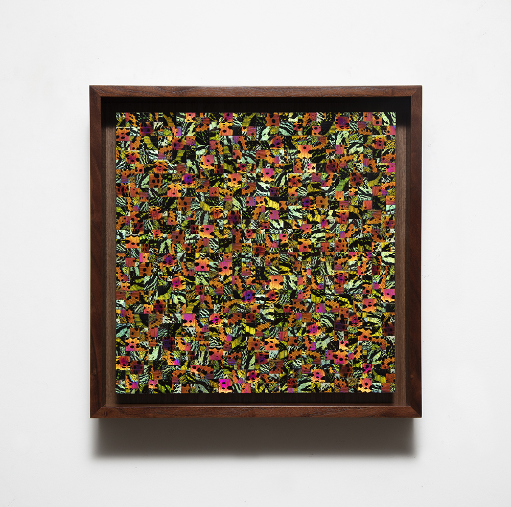 His recent series entirely composed of butterfly wings, is presented together with a new body of works made of obsidian’s shards. The regular sequence of the square-sized painting-without-paint is rather animated with both colour and movement. Each work is a parade of fragments, meticulously combined into organised geometrical compositions following the chromatic palette of the organic and inorganic specimens employed. The electric blues, citrines, ruby and emerald iridescences of the butterfly wings are alternated to the reflective shades of blacks and greys of the obsidian, resulting in pristine mosaics and chessboards between figuration and abstraction. Their making needs extreme care and a prolonged time — from the ethical sourcing of the materials to their surgical cutting and their cataloguing — leading to the final configurations. The titles unveil an analogous precision, as their archivist style indicates both the number of fragments (up to 2.876) and the species used.
