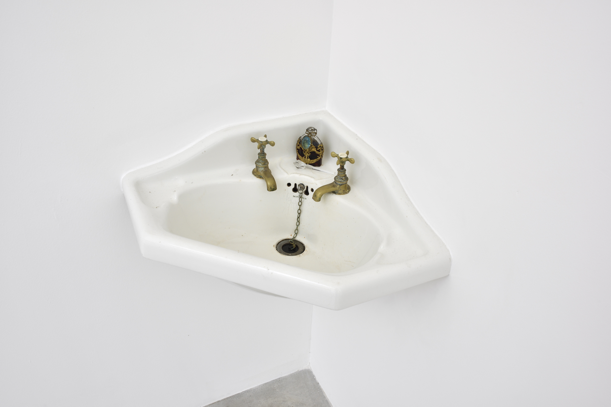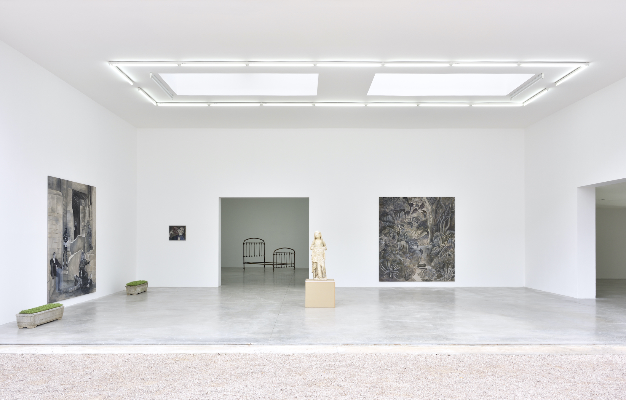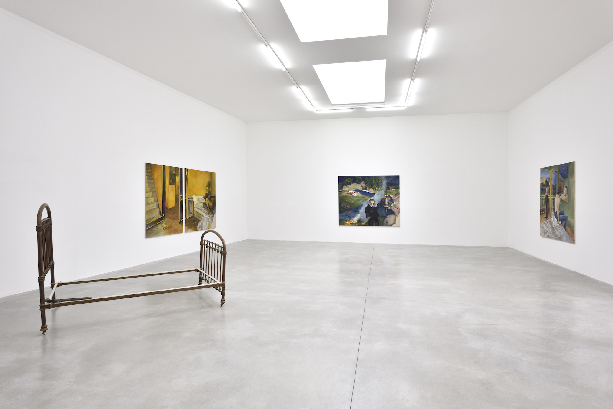 The paintings show languid bodies in domestic or outdoor settings. Liquid, transparent color is applied on raw linen canvas – the medium of the Moderns. Tilted faces lean on long and idle hands, à la Cocteau—he who kept his jacket sleeves unbuttoned on purpose. Echoing the paintings, constellations of found and made objects. Here, as if pulled from one of the canvases, placed at an angle, the iron frame of a vaguely Napoleon III-style bed has been sprinkled with coarse grey salt, to neutralize the spells that fellow vampires of Mulleady’s generation would not have failed to cast. A dueling pistol has been forgotten on the edge of the bed frame. How many lead bullets has it shot through the skin of unlucky losers? There, two rough cement planters have been sown with growing mustard seeds, which will bloom with yellow flowers during the course of the exhibition.