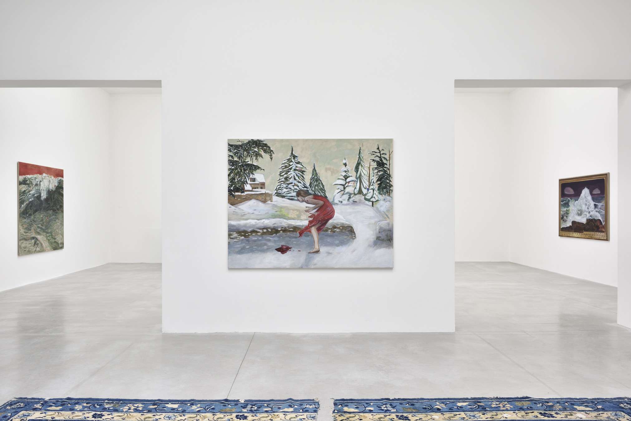In the corridor, like an antechamber, a Baccarat lamp snatched either from a brothel or a comfortable bourgeois interior (is there any difference?) illuminates a new series of paintings. Its red glow is reflected in the painted mirror placed at the end of the room, inviting viewers to double themselves too – as if in a story by Pierre Klossowski – and to mingle with sinuous, painted bodies.