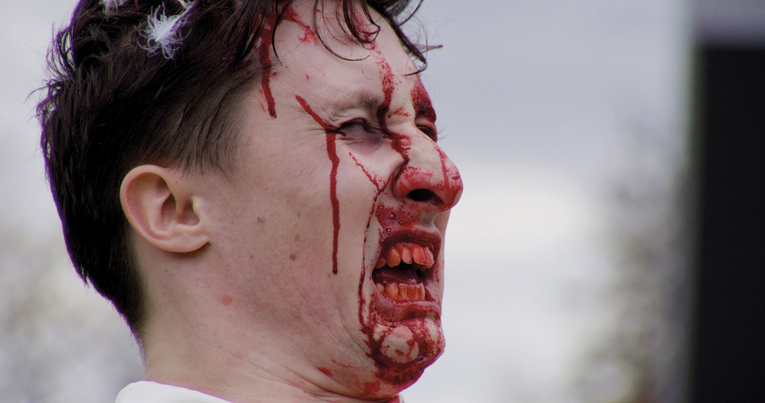 MS We just shot the destruction scene in the house and totally smashed up the set. It was a food and slime extravaganza. The cast were dressed up as giant mascots—tomatoes, bananas, bumblebees—they chainsawed the daylight out of everything. Hotdogs and ketchup and mayo all over their faces.