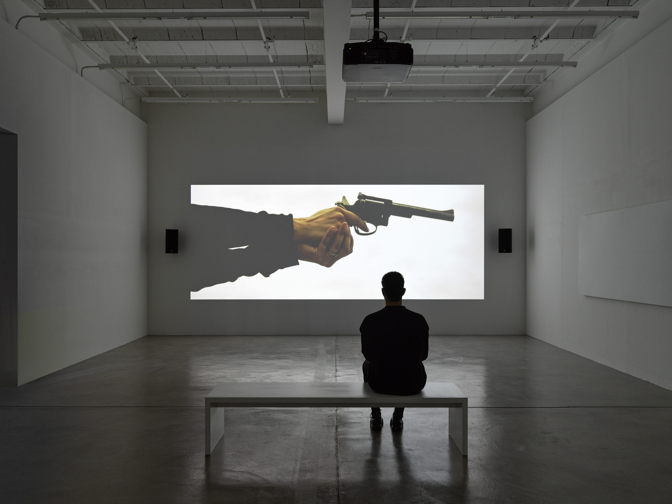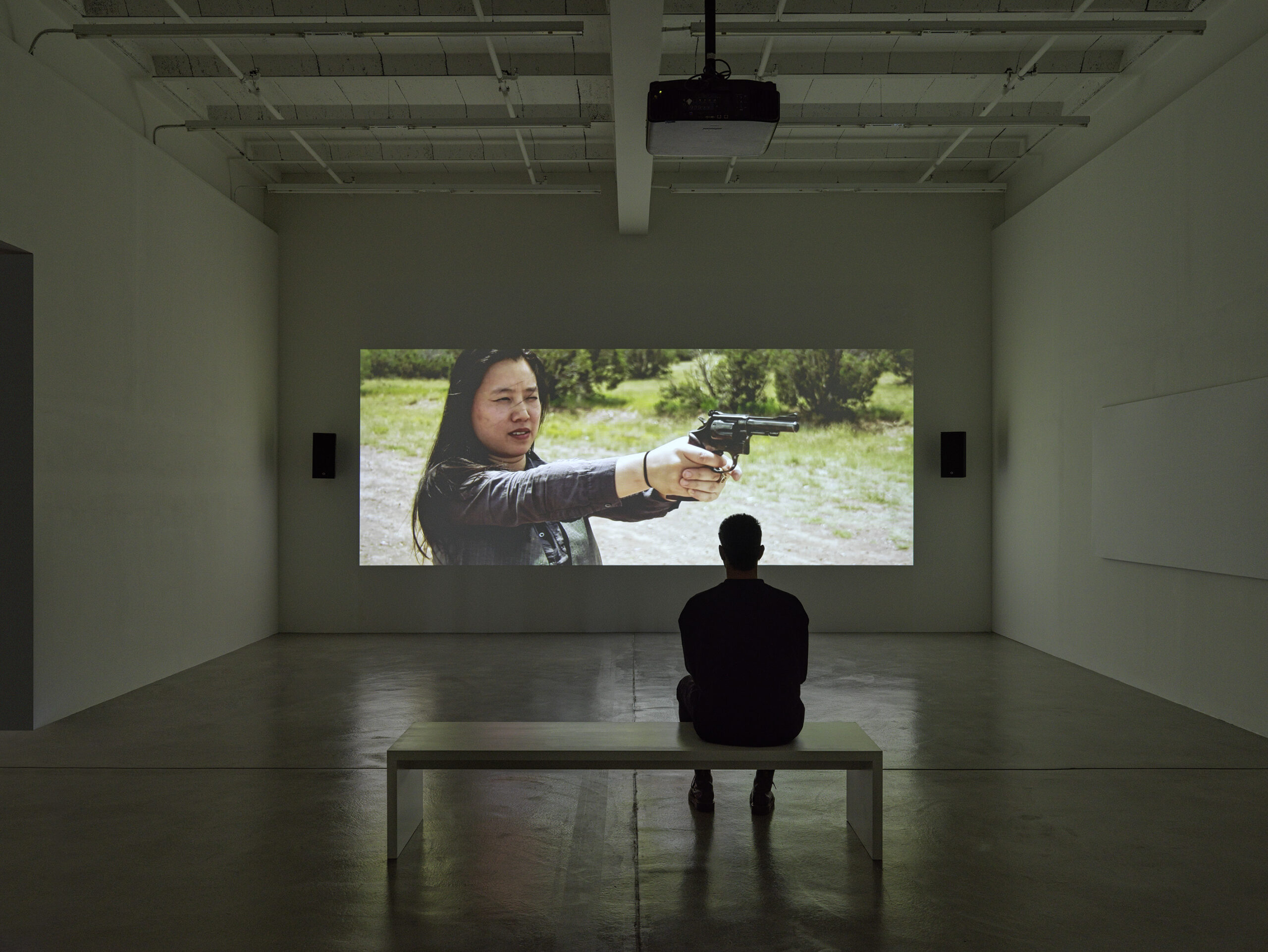 The first exhibited works are a series of scores for caliber revolvers, gauge shotguns, a ruger 10/20, and a 9 mm semi-automatic among other firearms; accompanied by a set of instructions for “experienced performers” and a composer’s disclaimer. Written by Raven Chacon, these scores were performed for his single-channel video Report (2001/2015), precisely a concert of gunshots. Starkly spare as much as unsettling in its blatant simplicity, the charged cacophony of percussive blasts is alternated with moments of silence in which distant echoes resonate in the Navajo ancestral lands, where the artist grew up and where the score was performed. The artist transforms such tools of aggression, or power in general, into instruments for musical resistance. “No pitch. No timbral changes. No volume. And maybe no tuning, no harmony. Nothing.” quotes the press release. Chacon is known for his exploration of refusal within sound and music. His escaping harmony becomes a strategy for breaching expected musical forms, as well as the privilege of classical musical composition and listening.