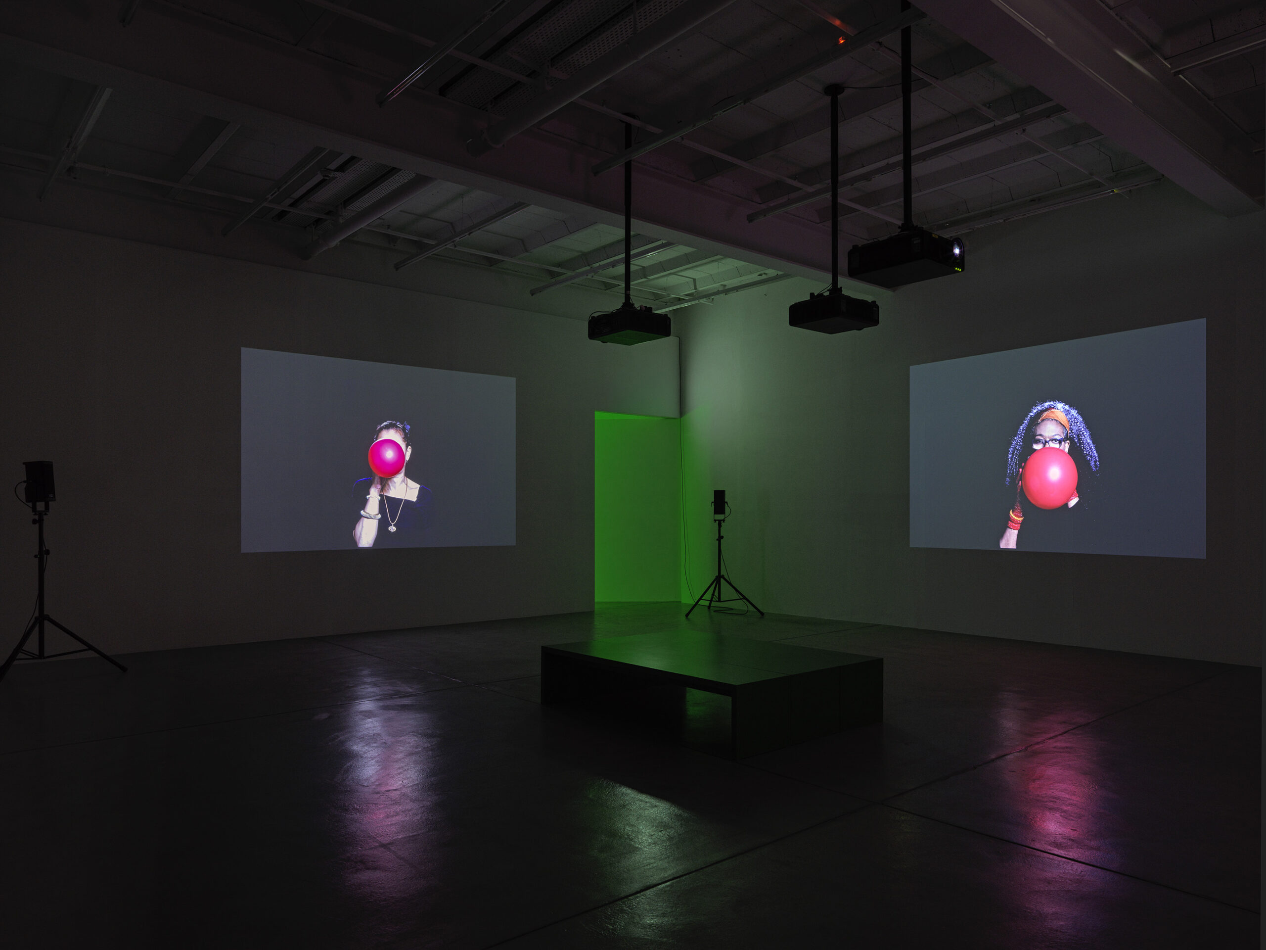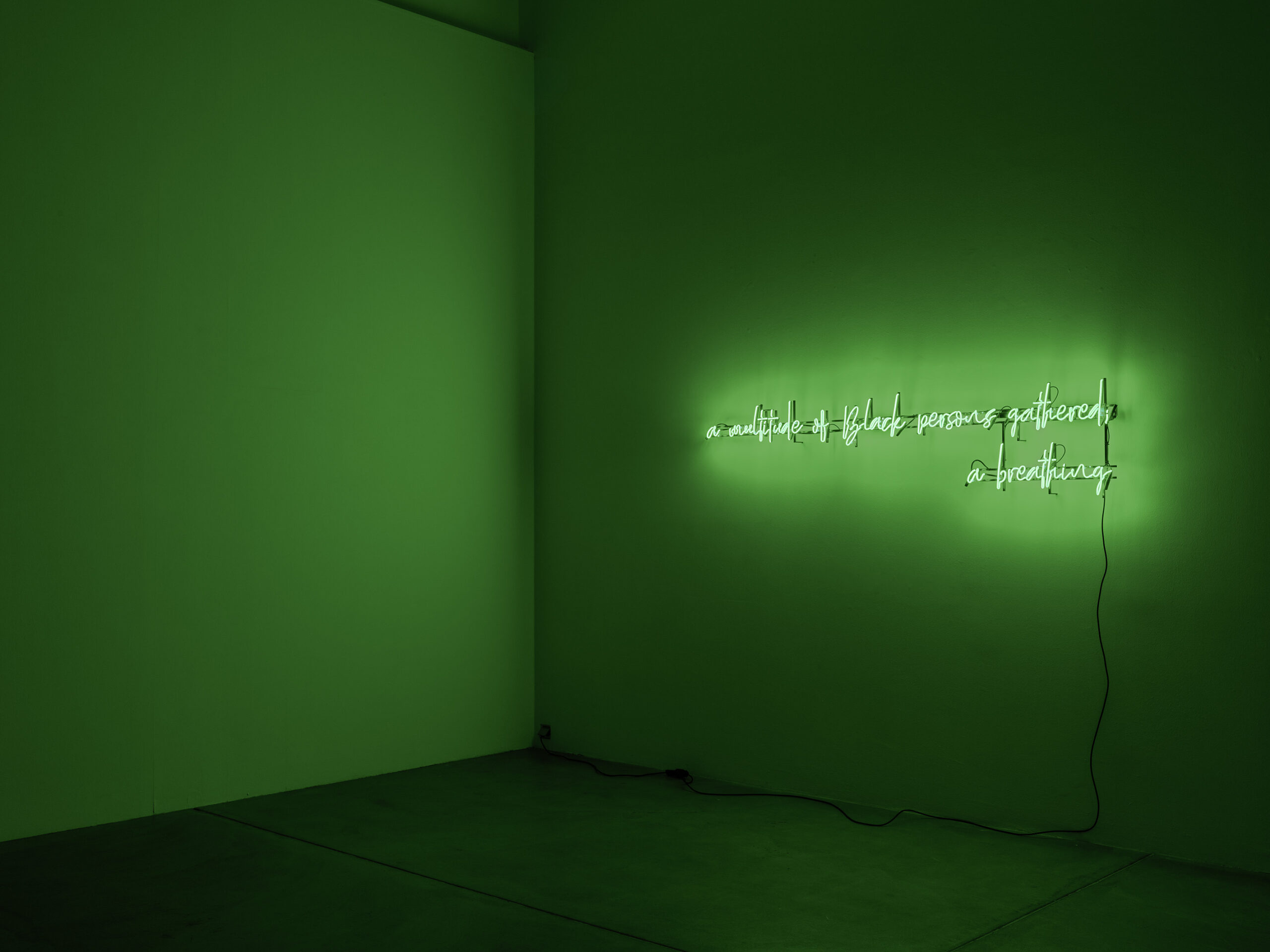 The last act of the show is dedicated to Belinda Kazeem-Kamiński. Her three-channel video installation Respire (2023) drags in a meditative exploration of Black breath. The video shows performers blowing a red balloon; each at their own rhythm and breath, the balloon adapting to the air it receives. The score here is for breaths and it unfolds as a sequence of mysterious murmurs beautifully musicalised in a soundtrack by artist Bassano Bonelli, a tribute to Curtis Mayfield’s song Keep On Keeping On (1971). Once again a sense of distant echoes emerges, as ghostly voices make memory and survival intertwine. A green neon work installed in an adjacent room renders Kazeem-Kamiński’s intentions even more evident. It’s a quote from Christina Sharpe situating breath as a gesture of defiance against systemic suffocation.