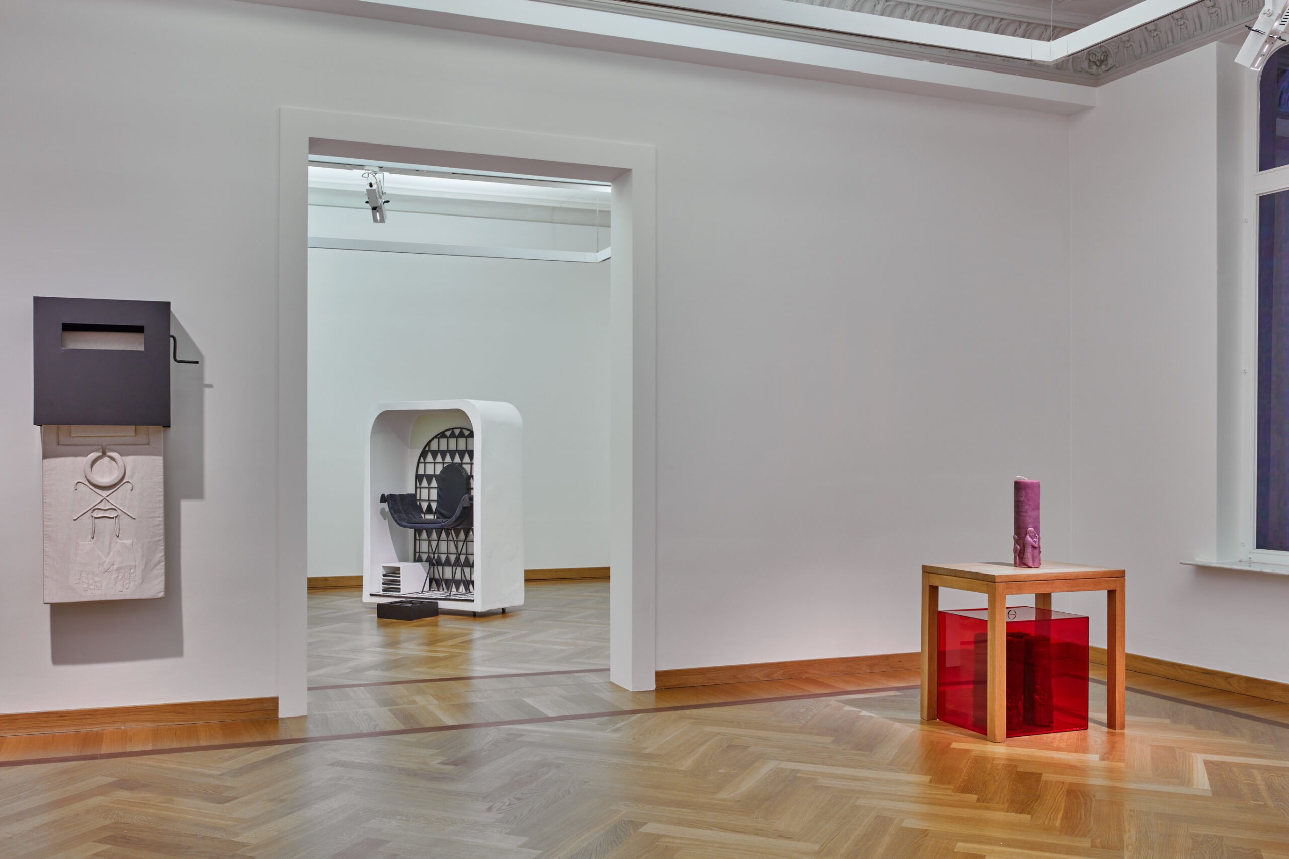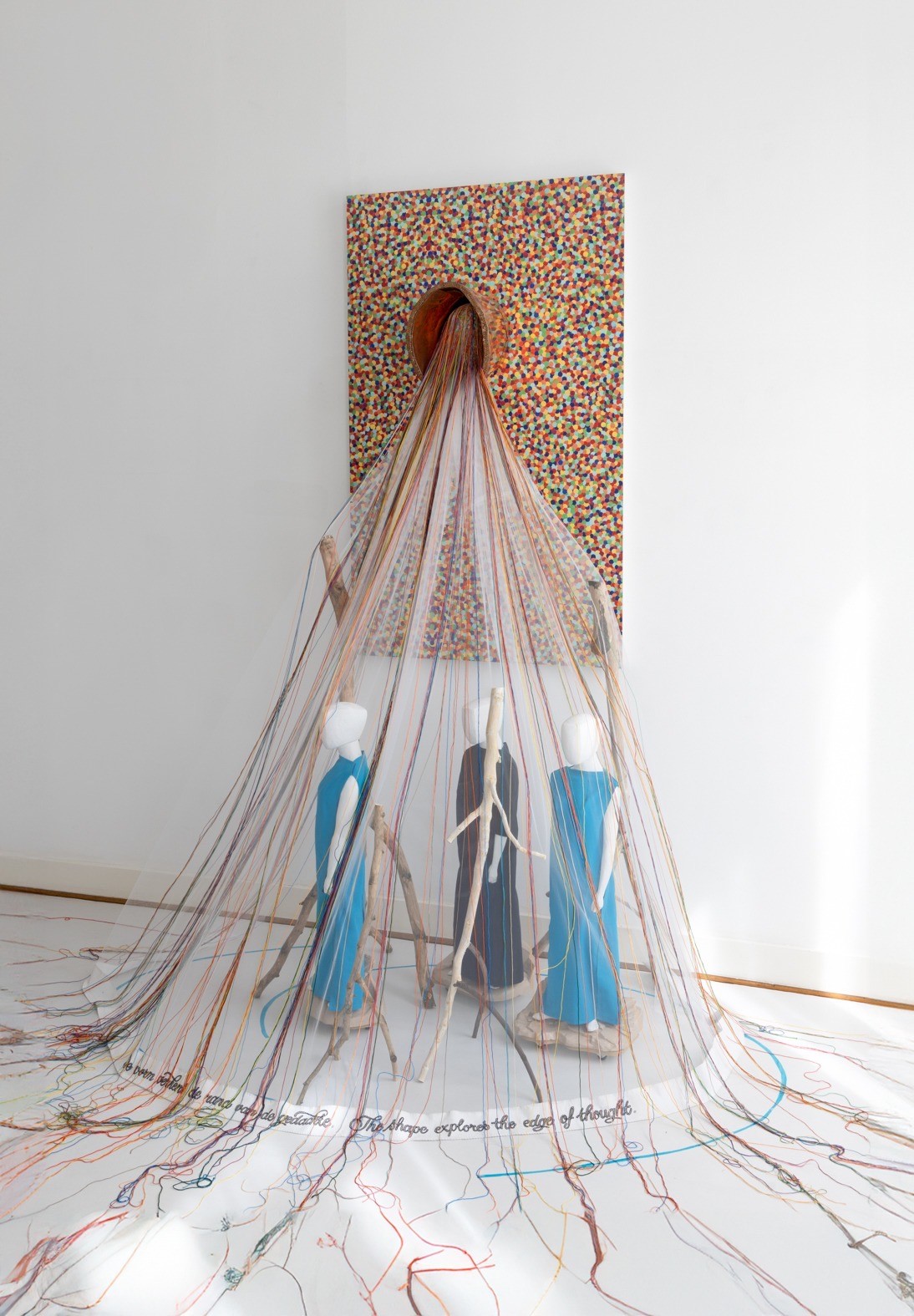 Hautman’s practice moves between metaphysical speculation and domestic intimacy, without privileging one over the other. Her visual language is modest yet surgical, and silence becomes syntax—each pause between materials and forms as charged as the objects themselves. That’s perhaps why Hautman’s works are understood and framed in the show as visual poems. Among the most recent productions, Voile (2024) echoes the structure of Institutionalized Dignity, presenting a wall-based work that projects sculpturally into the room. A gutter-like bucket emerges from a dotted, multicoloured canvas, functioning as a prism that generates radiating threads of colour. These lines seem to form the skeleton of a translucent tent of pink organza, where three loosely defined young figures find shelter. The veil, embroidered with the phrase “Form explores the edge of thought,” positions the work as a map of introspection—a meditation on the tension between fixity and flow, also well conveyed by the teenage of the three figures and the playful character of this work. The piece functions as both a portal and an index of Hautman’s broader cosmology. Overall, the exhibition at M Leuven opens a symbolic landscape where memory, identity, and emotion are rendered in an idiosyncratic language of objects. Unique and universal at the same time, Hautman’s vocabulary is deeply personal, yet it speaks to shared conditions of existence.