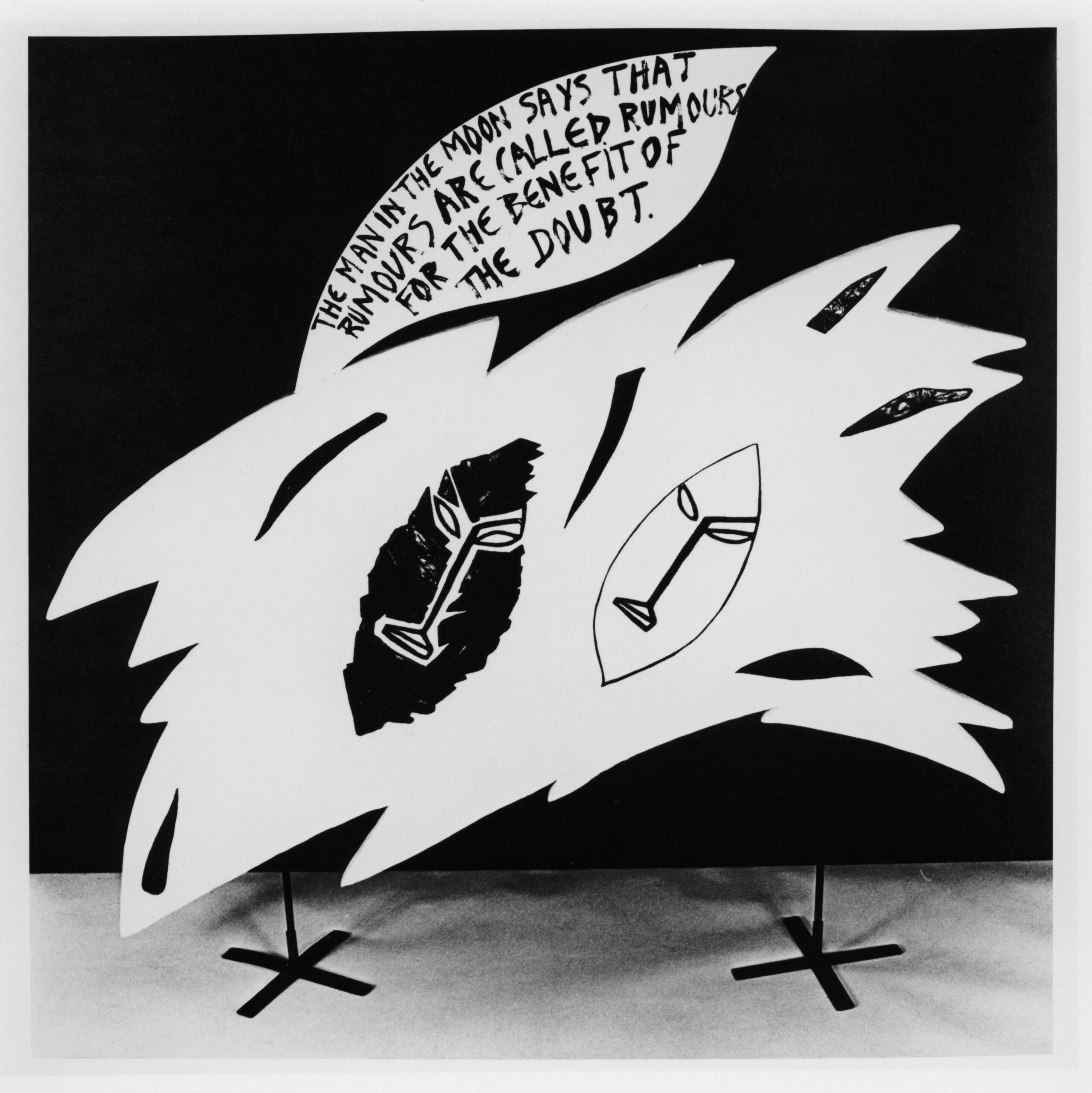 Existing literature on Hautman is scarce, but the exhibition’s unfolding reveals a practice defined by a persistent and eclectic personalisation of disciplinary boundaries. Her education at the Antwerp Academy, for instance, whose emphasis on classical sculpture is deliberately and playfully crossed. Emblematic of such ethos is the sculptural installation Institutionalized Dignity (1982, rebuilt in 2025), in which polyester, leather, and wood coalesce into a theatrical setting of ideological critique as two leather figures hunch beneath an eagle’s omnipresent gaze. The eagle, a traditional universal emblem of freedom, power and dignity, has also historically been appropriated by Western ideals; it is the official symbol of the United States of America, recognised as the “National Bird” and featured prominently in national currency, flags, and government buildings. The bust of the animal in Hautman’s installation—with its bright colours and kitsch notes—seemingly draws from both its symbolism within indigenous cosmologies and its instrumentalisation by power structures. Perhaps it’s no coincidence that the wings are omitted—clipped, even. The submissive posture of the two figures sitting below, combined with the modular, retro-futuristic furniture on which they sit, evokes a paradox of control and compliance—a mise-en-scène in which ideological forces are quietly internalised through strategy and design. This layering of cross-cultural references and symbolic tensions recurs across the show. Another example is Moonproject 1: Rumours (1981), inspired by a line from David Bowie’s song “Love You Till Tuesday” (1967), which anchors a series of six sculptural pieces (five shown here). Here, the moon becomes a cypher for transformation and cyclical renewal, while its evolving symbolic status from celestial mystery to colonial conquest is subtly put forward.