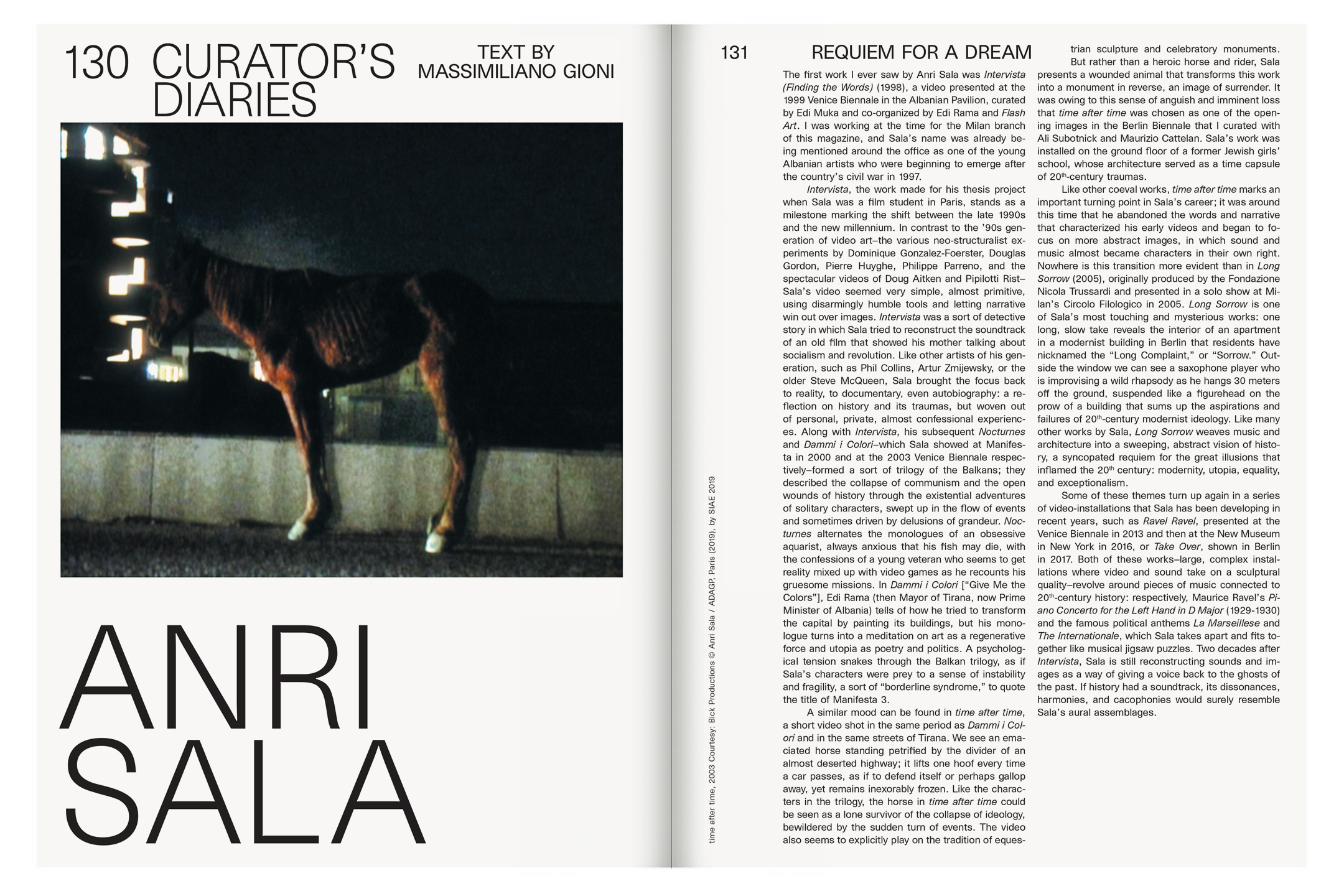 Massimiliano Gioni continues his collection of private memories by compiling a few more pages of his curator’s diaries – highlighting this time Anri Sala’s iconic work time after time (2003), presented on the occasion of the 4th Berlin Biennale that Gioni curated with Ali Subotnick and Maurizio Cattelan in 2006.